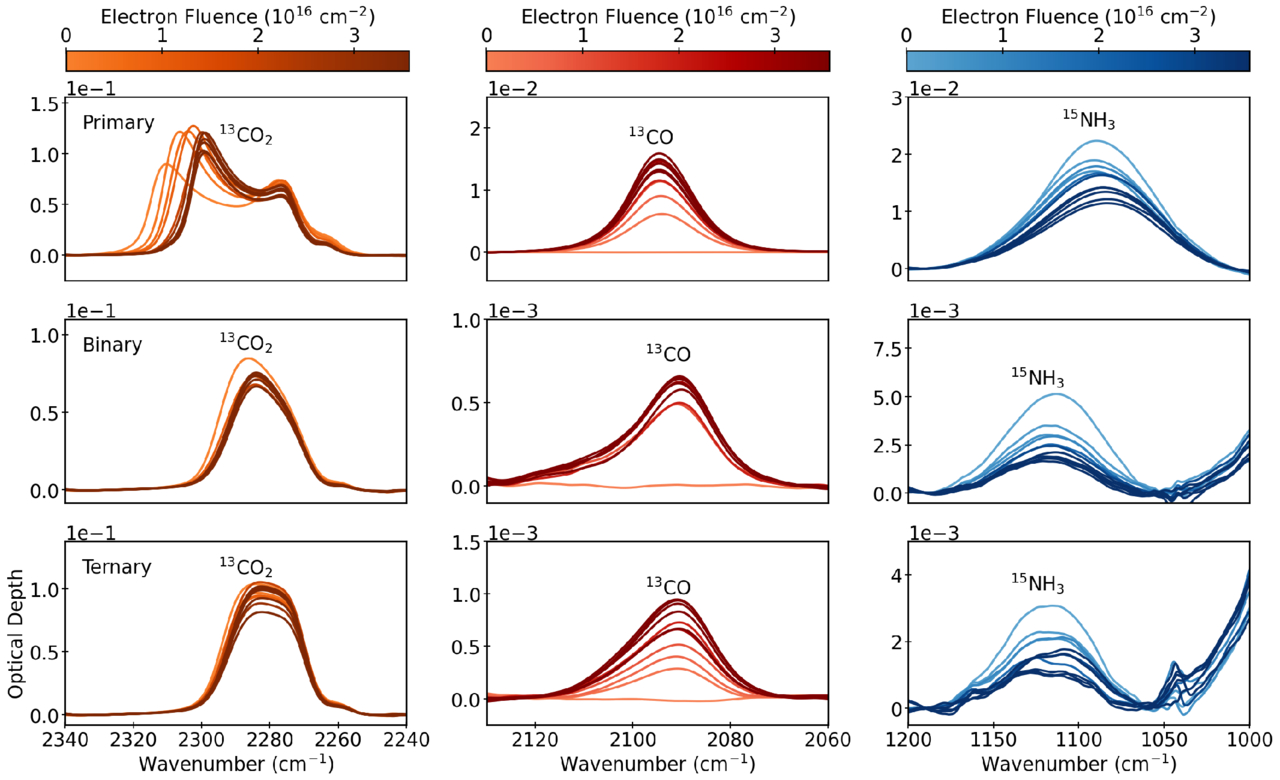 The infrared spectral bands of CO2 (left), CO (middle), and NH3 (right) during electron bombardment of primary ices (top), binary ices (middle), and ternary ices (bottom). The baselines used here are the same as those described in Section 2.3.