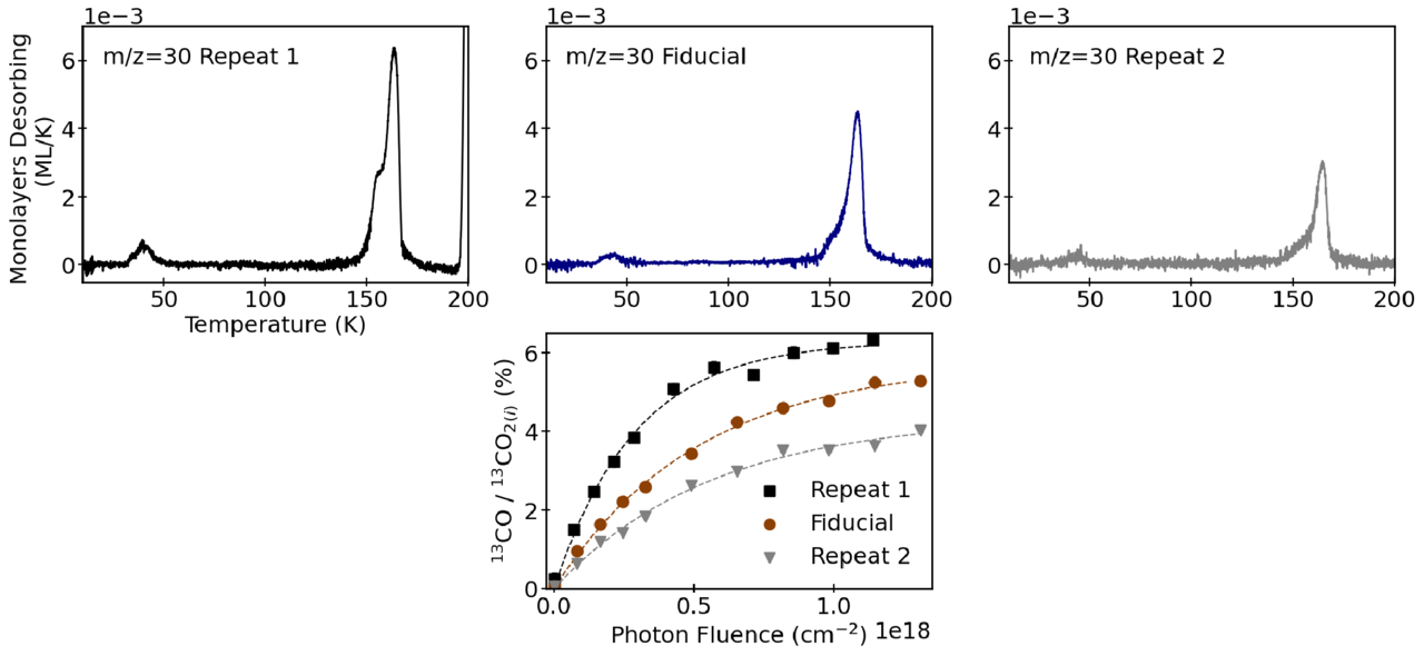 Top: the three 15N2 TPD curves from the three repeat experiments. Bottom: the three CO formation curves from the three repeat experiments.
