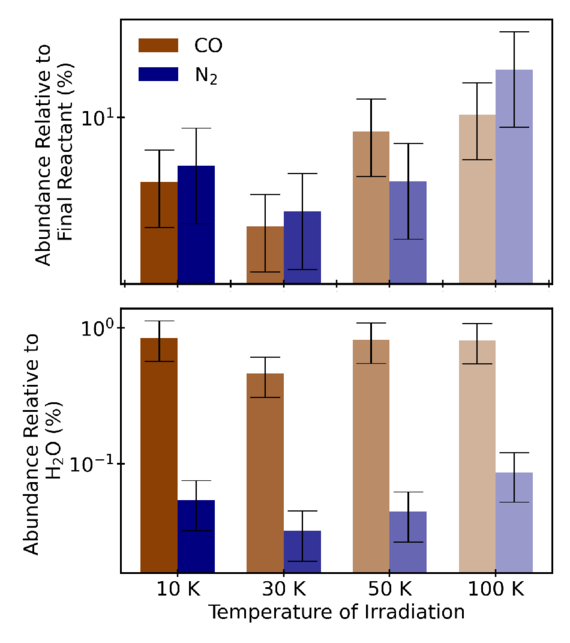 A summary of the CO and N2 formed following irradiation of ternary ices at various temperatures. The reactant for CO is CO2, and the reactant for N2 is NH3.
