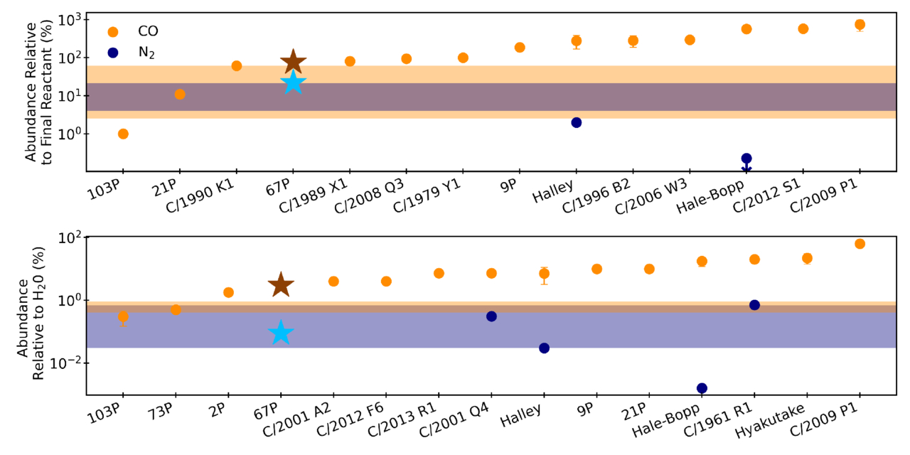 A summary of the CO and N2 reported in various comets with respect to parent molecule (top) and with respect to water (bottom). The CO/CO2 ratios are reported by O. H. Pinto et al. (2022) and references within. N2 abundances with respect to water are directly reported for three of these comets (N. Iro et al. 2003; L. Le Roy et al. 2015; A. J. McKay et al. 2019), and we calculated the N2 abundances for C/2001 Q4 and C/1961 R1 from the N2/CO and CO/H2O ratios compiled by S. Anderson et al. (2023). For Comet 67P, we use the N2 abundance reported by M. Rubin et al. (2019), and the CO, CO2, and NH3 values reported by M. Läuter et al. (2020). For clarity, we exclude the results from Comet C/2016 R2, which report CO and N2 abundances relative to water of (30,800% ± 3500%) and (1550% ± 370%), respectively (A. J. McKay et al. 2019). Comet 67P markers are star shaped for emphasis. Shaded orange and blue regions represent the CO and N2 abundances reported following photolysis and radiolysis, respectively. Downward-pointing arrows indicate upper limits on reported hypervolatile abundances.
