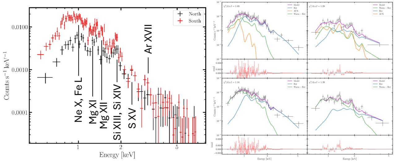 Left: combined spectra from all three observations extracted from the northern regions and the southern regions (i.e., encompassing all the three north and five south regions in Figure 2, respectively). We label the various emission lines evident in the spectra. Spectra extracted from the composite southern region from observation 19498. Top middle: the CX emission is in orange (ACX), the warm–hot thermal plasma component (APEC) is in green, and the hot thermal plasma component is in blue. The data points are in black crosses, and the residuals to the best-fit model are given below. We find that in the south, a significant portion of the broadband X-ray emission (∼38%) is dominated by CX emission. Bottom middle: same as the top middle panel, but the model does not include CX. Without CX, the model has larger residuals at soft X-ray energies and yields a statistically worse fit. Top right and bottom right: same as the middle panels, but for the composite northern region. We do not find any improvement in the fitting when using the ACX model.
