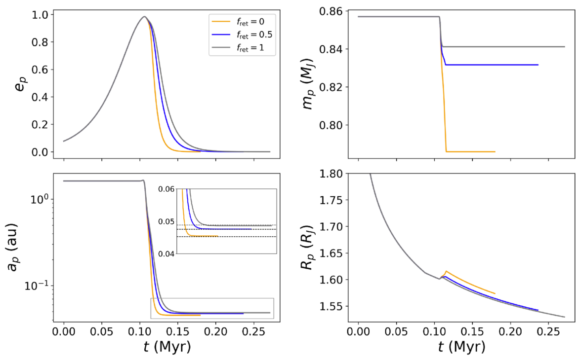 Time evolution of ep (top left), ap (bottom left), mp (top right), and Rp (bottom right) for an example system that forms a hot Jupiter through a single quadrupole cycle. Curves show evolution with varying fractions of angular momentum return, including fret = 0 (orange curves), fret = 0.5 (blue curves), and fret = 1 (gray curves). The ap panel (bottom left) shows a zoomed-in view of the final circularization locations of the hot Jupiter (inset panel corresponds to the gray rectangle), with dashed black lines showing analytical predictions from Equation (14). The system parameters are m* = 1.427M⊙, mp = 0.857MJ, mc = 0.838M⊙, ap = 1.621 au, ac = 82.846 au, ep = 0.077, ec = 0.084, ω1 = 46﹩\mathop{.}\limits^{\unicode{x000b0}}﹩075, ω2 = 212﹩\mathop{.}\limits^{\unicode{x000b0}}﹩893, and i = 84﹩\mathop{.}\limits^{\unicode{x000b0}}﹩210.