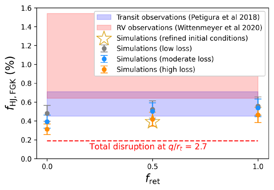 Comparison of the hot Jupiter occurrence rate from the transit observations of E. A. Petigura et al. (2018; shaded blue region), radial velocity observations of R. A. Wittenmyer et al. (2020; shaded red region), and those estimated from the simulations in this work. To obtain the simulated occurrence rates, we use the fraction of FGK stars in wide binaries from D. Raghavan et al. (2010) and the fraction of systems that harbor cold Jupiters as a source population in B. J. Fulton et al. (2021), then multiply by the fraction of cold Jupiters that become hot Jupiters in our simulations (given in Table 1). We show the rates for the varying mass-loss prescriptions of low loss (gray points), moderate loss (blue points), and high loss (orange points) as a function of varied angular momentum return fret. The rate for the M0.5set2 simulations (moderate loss, fret = 0.5, Set 2 initial conditions) is shown with a gold star. The occurrence-rate estimate from the NoLoss run is also plotted (dashed red line), which uses the approach taken in previous studies of removing planets that graze q/rt = 2.7 (e.g., C. Petrovich 2015b; G. C. Weldon et al. 2025).
