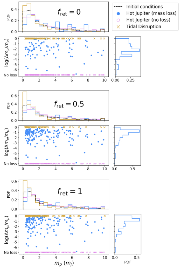Mass-loss fraction as a function of initial planetary mass in the moderate-loss simulations. Hot Jupiters that undergo mass loss are shown as blue dots, hot Jupiters that undergo no mass loss as violet open circles, and tidal disruptions as orange crosses. The angular momentum return fraction is varied from fret = 0 (top), to fret = 0.5 (middle), and fret = 1 (bottom). For each choice of fret, we show the marginal histograms of the mass distributions (top) and mass-loss fractions of hot Jupiters that undergo mass loss (right), using the same color-coding. The initial mass distribution is shown with a dashed black curve. We see that low-mass planets undergo frequent tidal disruption. As angular momentum increases, more planets are “saved” and survive as highly stripped hot Jupiters.