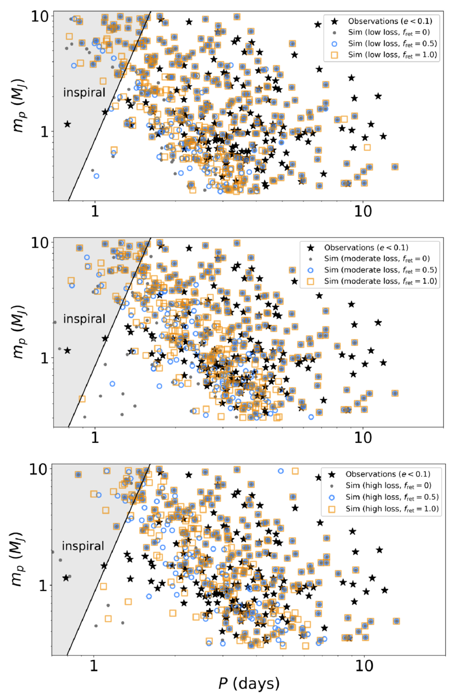 Mass–period distribution for observed hot Jupiters (black stars) that are relatively circularized (measured eccentricities e < 0.1), along with the final state of surviving hot Jupiters in the simulations (gray dots denote fret = 0, blue open circles fret = 0.5, and orange open squares fret = 1). The observed sample of hot Jupiters is taken from the NASA Exoplanet Archive (accessed 2025 August 22; e.g., R. L. Akeson et al. 2013; NASA Exoplanet Archive 2025). We select systems with 0.3MJ < mp < 10MJ and ap < 0.1 au. The top row corresponds to the low-loss case, the middle row corresponds to the moderate-loss case, and the bottom row corresponds to the high-loss case. The shaded region shows where inspiral and merger with the host star from stellar tidal dissipation is efficient, calculated using the calibration from B. M. S. Hansen (2010).