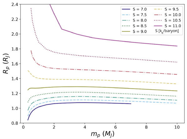 Curves of constant central entropy showing planetary radius as a function of planetary mass, from MESA.