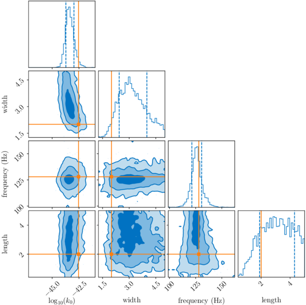Posteriors of the kernel parameters for the breathing mode injection. We show the injected values in orange. We inject a draw from the kernel as a breathing mode signal into the individual detectors and analyze the resulting signal in the null stream. The k0 posterior rules out the lower bound of the prior ﹩{\mathrm{log}}_{10}({k}_{0})=-47﹩, indicating the Gaussian process is detecting a signal.