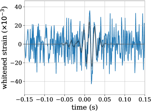 A reconstruction of the deviation signal δs (black) for a breathing polarization injection into individual detectors plotted along with the whitened data (blue). The data are within the 90% credible interval of δs (gray shaded region) estimated by the Gaussian process, showing the Gaussian process can capture the signal in the data.