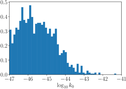 Posterior of ﹩{\mathrm{log}}_{10}{k}_{0}﹩ for an injection of only +/ × polarizations into the detectors. It is consistent with the lower bound of the k0 prior, indicating there is no signal in the null stream.