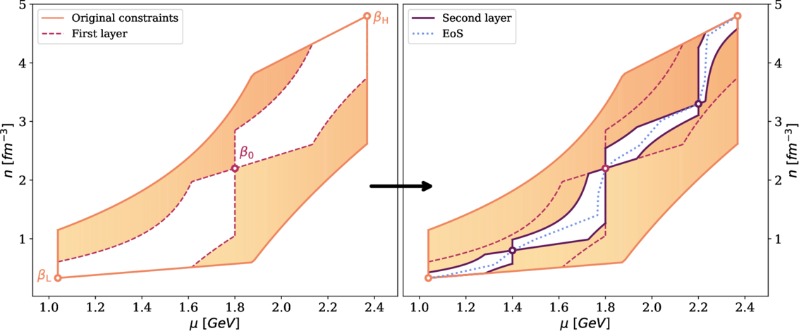 Example of a two-step self-similar refinement (fractal). Knowledge of the EoS at low and high densities (βL = (μL, nL, pL) and βH = (μH, nH, pH)) implies constraints on points β0 lying between them. Once a point β0 is chosen, similar constraints are imposed on the intervals [βL, β0] and [β0, βH]. Iteratively refining each interval by introducing new points eventually leads to a complete EoS illustrated by the blue dotted line obtained after multiple iterations passing through the specified points.