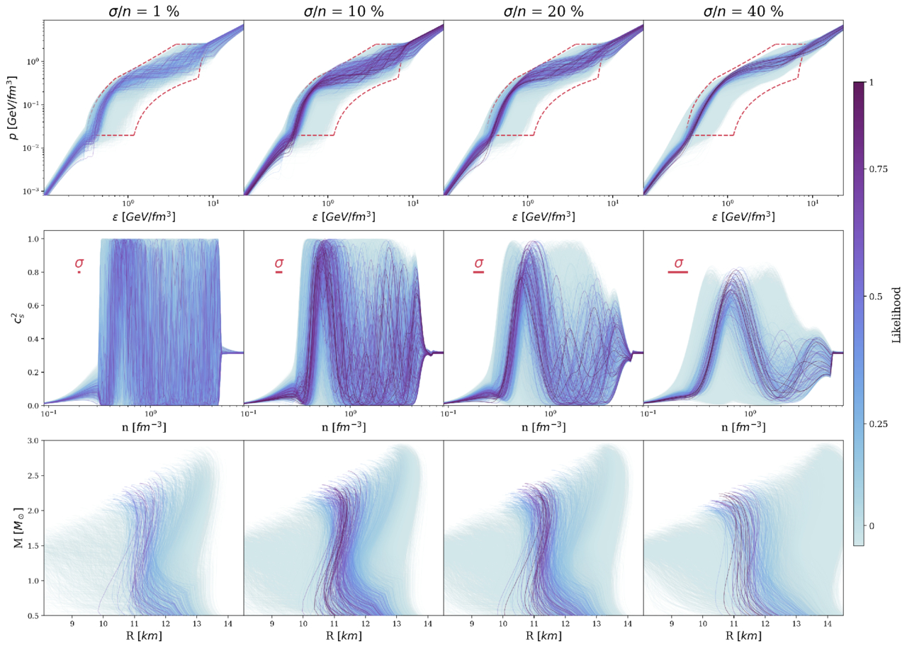 Progression of the posterior EoS (ε versus p), speed of sound (﹩{c}_{s}^{2}﹩ versus n), and the mass–radius relation (M versus R) as a function of the relative correlation length σ/n = 1%, 10%, 20%, and 40%. Each EoS drawn from the prior is colored according to the combined likelihood function. The likelihood function is normalized separately to the maximum likelihood for each fixed correlation length. As the correlation length increases, the global structure of the EoS with significant softening at high densities becomes clearer. The bar marked with σ indicates the correlation length associated with each column. The relative correlation length corresponds to a fixed length on a logarithmic axis.