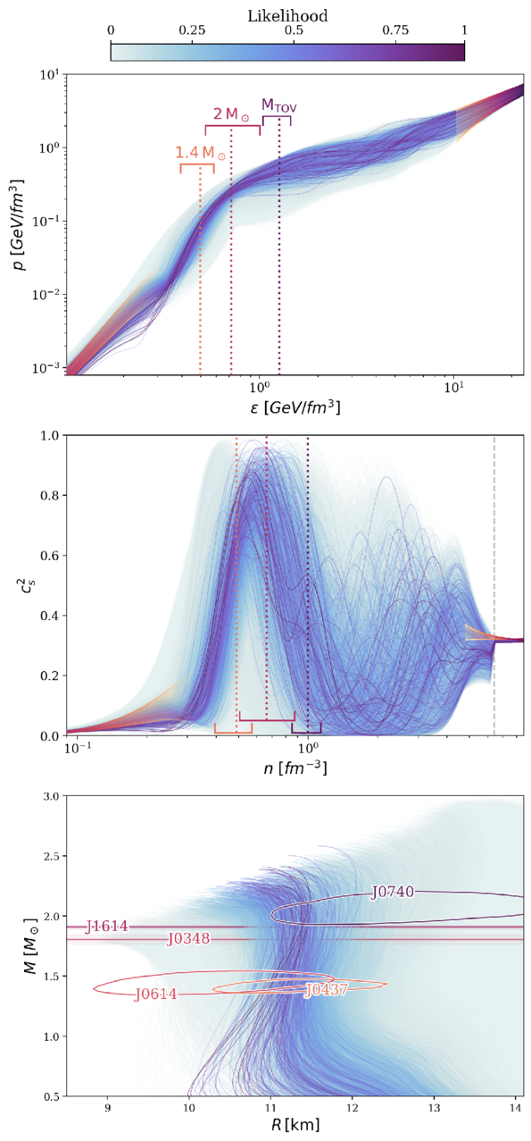 Posterior of p(ε), ﹩{c}_{s}^{2}(n)﹩ and M(R) from the hierarchical model discussed in Section 4 with the correlation length taken from a uniform distribution σ/n ∈ [0.2, 0.4]. The dotted vertical lines and the associated bars correspond to the mean and 1σ credible intervals for densities reached in the centers of 1.4 M⊙, 2 M⊙, and MTOV stars, while the contours in the lowest panel represent the 68% credible regions of the corresponding NICER observations.