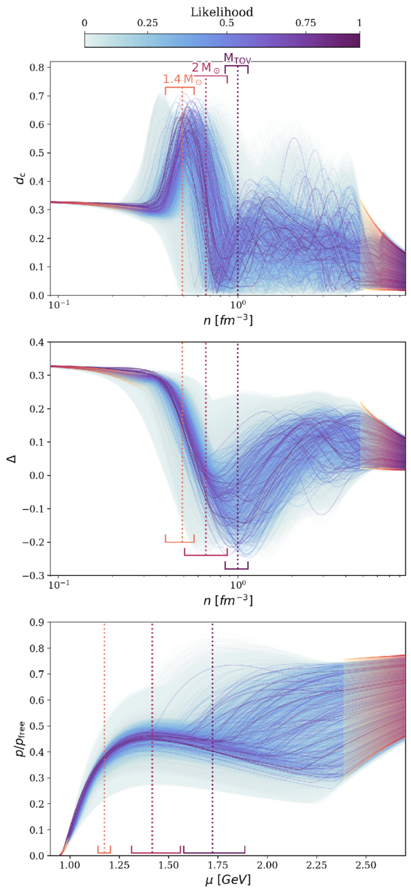 Posterior of dc(n), Δ(n), and p/pfree(μ) (see main text for definitions) from the hierarchical model discussed in Section 4 with the correlation length taken from a uniform distribution σ/n ∈ [0.2, 0.4]. The dotted vertical lines and the associated bars correspond to the mean and 1σ credible interval for densities reached in the centers of 1.4 M⊙, 2 M⊙, and MTOV stars.