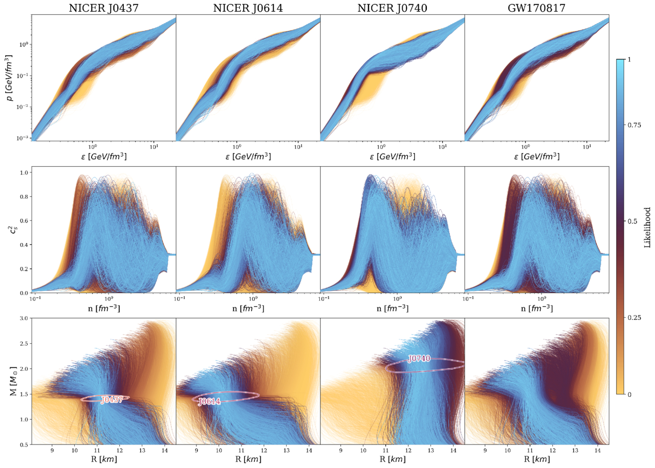 A sample of EoSs, colored according to the likelihood functions derived from various individual X-ray and gravitational-wave observations. NICER J0437 corresponds to the simultaneous mass–radius measurement of PSR J0437-4715 from D. Choudhury et al. (2024), NICER J0614 to that of PSR J0614-3329 from L. Mauviard et al. (2025), NICER J0740 to that of PSR J0740+6620 from A. J. Dittmann et al. (2024), and GW170817 to the gravitational-wave observations reported in B. P. Abbott et al. (2019). The prior used here is the hierarchical model discussed in Section 4. The contours in the lowest panel represent the 68% credible regions of the corresponding NICER observations.