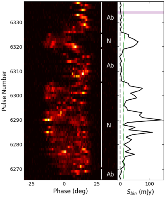 A sequence of 73 consecutive single pulses from RRAT J1541+4703 in its NP state, demonstrating mode-changing behavior. The right panel shows the Sbin values (black) and separation thresholds (green) for each pulse, with purple horizontal fills indicating null pulses.