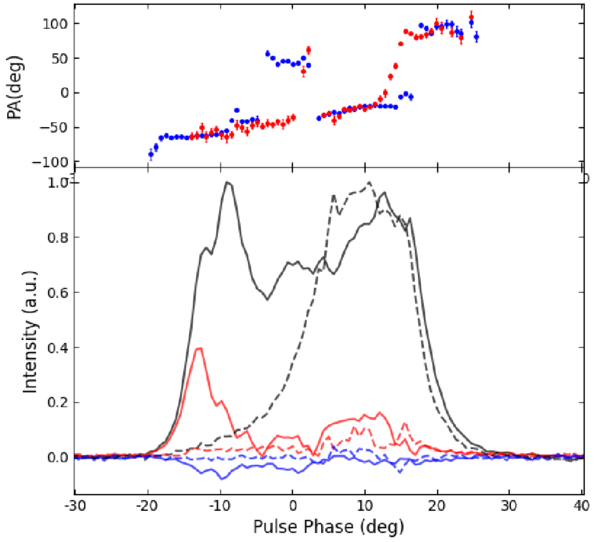 The average polarization properties of the normal (solid lines) and abnormal (dotted lines) modes for Epoch 7. The PA swings for the normal and abnormal modes are represented by blue and red error bars, respectively.