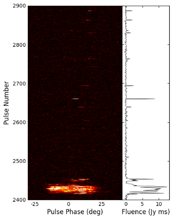 Single-pulse stack of 500 consecutive pulses from RRAT J1541+4703, exhibiting both RRAT and pulsar emission states. The right panel shows the fluence for each pulse, with distinct null pulses observed in both states.
