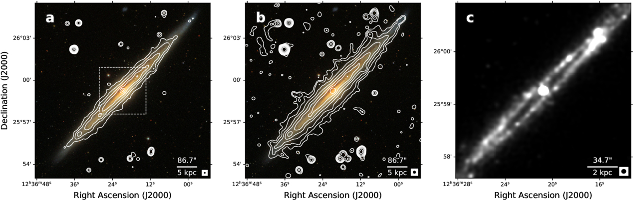 S-band total intensity images of NGC 4565. (a) Contours from the robust zero weighting image are overlaid on a three-color SDSS optical image constructed from the i, r, and g filters. The contour levels start at 3σ = 10.5 μJy beam−1 and increase by factors of 2. The beam size of this panel is ﹩4\mathop{.}\limits{^{\prime\prime} }99\times 4\mathop{.}\limits{^{\prime\prime} }62﹩. The white box indicates the region shown in panel (c). (b) Contours from the 10″ UV-tapered image, overlaid on the same SDSS optical image. The contours begin at 3σ = 11.2 μJy beam−1 and increase by factors of 2. The beam size of this panel is ﹩10\mathop{.}\limits{^{\prime\prime} }32\times 10\mathop{.}\limits{^{\prime\prime} }26﹩. (c) A detailed grayscale view of the central ring-shaped structure from the robust zero-weighting image. In each panel, the synthesized beam is shown as a black ellipse in the bottom-right corner.