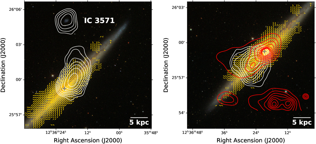 Comparison of magnetic field orientations with multiphase gas structures in NGC 4565. The left panel shows the H I channel map at 1267 km s−1 (G. Heald et al. 2011), displayed as contours overlaid on the SDSS optical image. Contours start at 1 mJy beam−1 and increase by factors of two. The right panel presents the soft X-ray emission (0.5–1.5 keV; red contours), together with the H I emission at 1164 km s−1 (white contours; G. Heald et al. 2011) on the same optical background. We note that the distinct X-ray enhancement visible in the bottom-right corner is a background galaxy cluster at a redshift of ∼0.62 (E. Koulouridis et al. 2021). In both panels, magnetic field orientations are shown as yellow lines, and the galactic center is indicated by a cross.