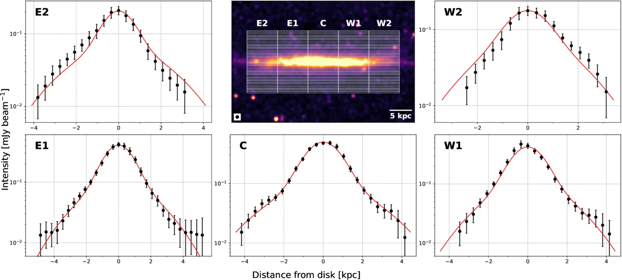 Vertical profiles of the nonthermal radio continuum emission at the S-band. The top-center panel shows the locations of the five analysis strips (E2, E1, C, W1, and W2) overlaid on the nonthermal intensity map. The other five panels display the corresponding vertical profile for each strip, arranged symmetrically around the setup panel. In each profile panel, the black points represent the measured flux density, averaged within 6″ × 120″ (0.35 × 6.92 kpc) boxes. Positive distances are to the north of the major axis, and negative distances are to the south. The red curve is the best-fit two-component Gaussian profile.