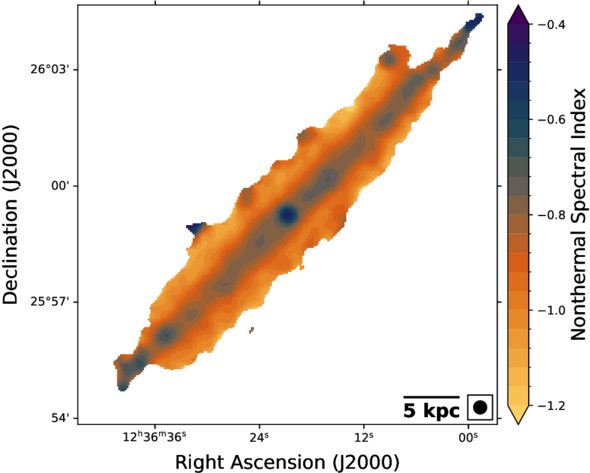 Distribution of the nonthermal spectral index derived by fitting a single power law to the 144 MHz (LOFAR), 1.57 GHz (VLA L-band), and 3.0 GHz (VLA S-band) data. The map is visualized using the colormap from J. English et al. (2024). Only regions with intensities >3σ at all three frequencies are taken into account. The beam of 20″ is displayed in the bottom-right corner.