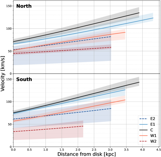 Velocity profiles derived from the advection model. The top and bottom panels display the results for the northern and southern segments, respectively. The solid (E1, C, W1) and dashed (E2, W2) lines show the best-fit solutions, while the shaded areas indicate the 1σ uncertainties.