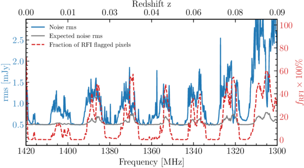 Frequency dependence of the noise level (blue curve, left axis) and the corresponding fraction of RFI-masked pixels (red dashed curve, right axis). The bottom axis shows the observed frequency in MHz, while the top axis indicates the corresponding redshift of the HI line. The secondary y-axis illustrates the fraction of RFI-masked pixels over the same frequency range. The gray curve represents the expected rms increase induced by RFI flagging, which is estimated via Equation (6).