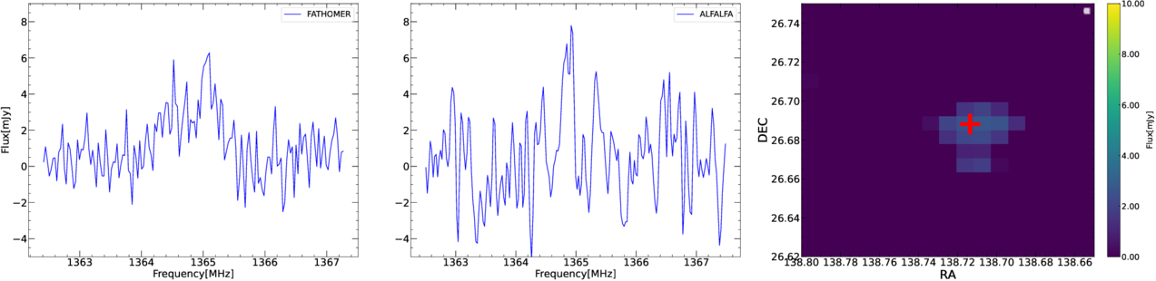 Frequency spectra for galaxy AGCNr 191363 in FATHOMER (left) and ALFALFA (middle). The right panel is the sky map in FATHOMER. The signal in ALFALFA is relatively weak, with S/N = 4.3. In FATHOMER, we get a higher S/N (S/N = 6.3) and confirm that this signal should be real.