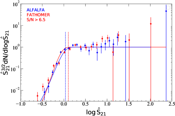 Distribution of ﹩{\hat{S}}_{21}^{3/2}{\rm{d}}N/{\rm{d}}\mathrm{log}{\hat{S}}_{21}﹩ vs. ﹩\mathrm{log}{\hat{S}}_{21}﹩ from the HI galaxies with S/N ≥ 6.5, in the ALFALFA (blue) and FATHOMER (red), to evaluate the completeness. In the FATHOMER, we can join the Code 1 and Code 2 candidates. The vertical dashed lines represent the flux where the survey completeness is 90%. The 90% completeness is according to the fit of ﹩{\hat{S}}_{21,90 \% }﹩, and the corresponding logarithmic values are 0.10 for FATHOMER and 0.034 for ALFALFA.