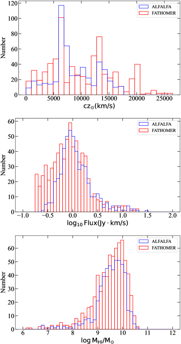 Top: histograms of the measured heliocentric velocity (cz⊙). Middle: histograms of the measured H I flux. Bottom: histograms of the measured H I mass. The results of the ALFALFA and the FATHOMER galaxy samples in the same sky area are shown in blue and red, respectively.