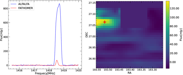 Frequency spectra (left) and sky map (right) of the galaxy AGCNr 8024, for which the H I line was not successfully recorded in FATHOMER. The blue and red lines represent the spectrum obtained by ALFALFA and FATHOMER, respectively. The right map is from FATHOMER, and the red cross labels the position of this galaxy.