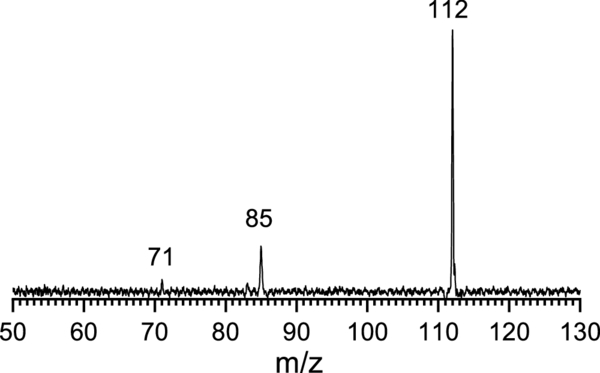 EPD mass spectrum of HMT+ (m/z 140) observed at λ = 310 nm (32,258 cm–1), revealing the fragment ions m/z 112, 85, and 71.