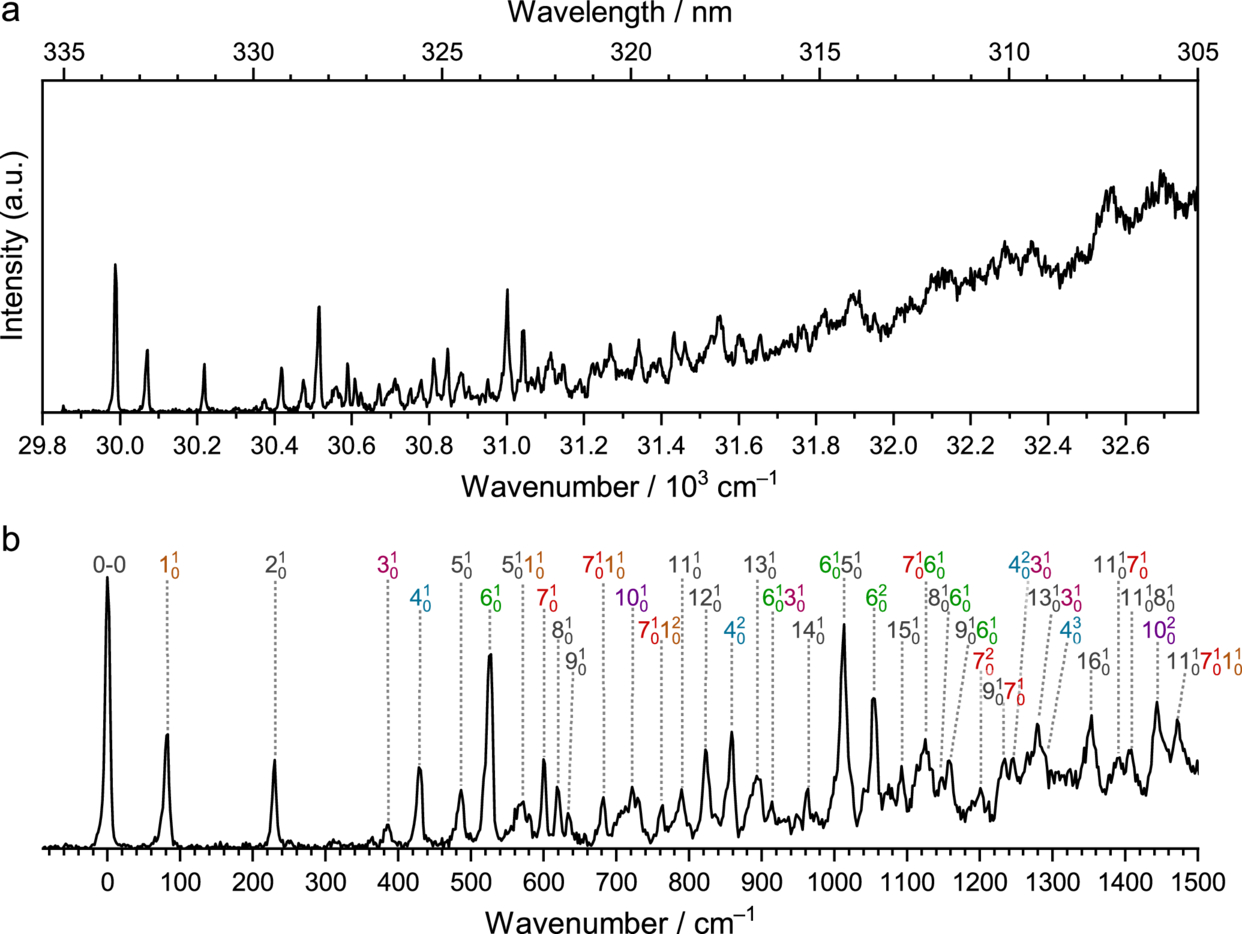 (a) Total EPD spectrum of HMT+ between 29,850 and 32,790 cm–1 (305–335 nm). (b) EPD spectrum in the vicinity of the band origin of the D3 state as a function of internal energy, with suggested vibrational assignments (Table 2).