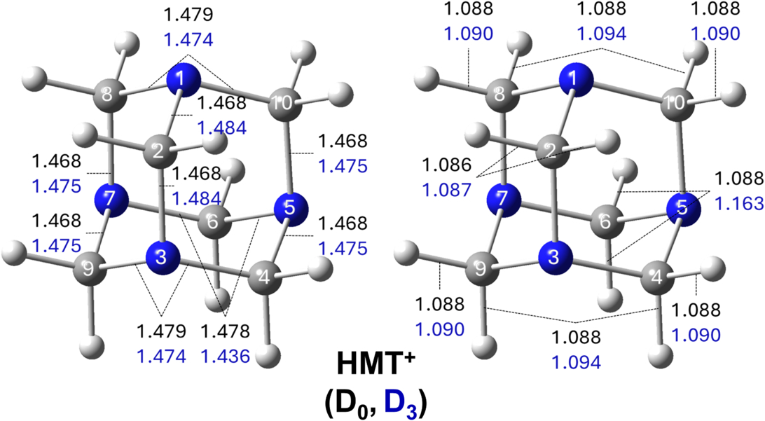Equilibrium C–N (left) and C–H (right) bond lengths (in angstroms) of HMT+ in the D0 and D3 electronic states (UB3LYP/cc-pVTZ). Both structures have Cs symmetry and are used to produce the Franck–Condon simulation in Figure 7.