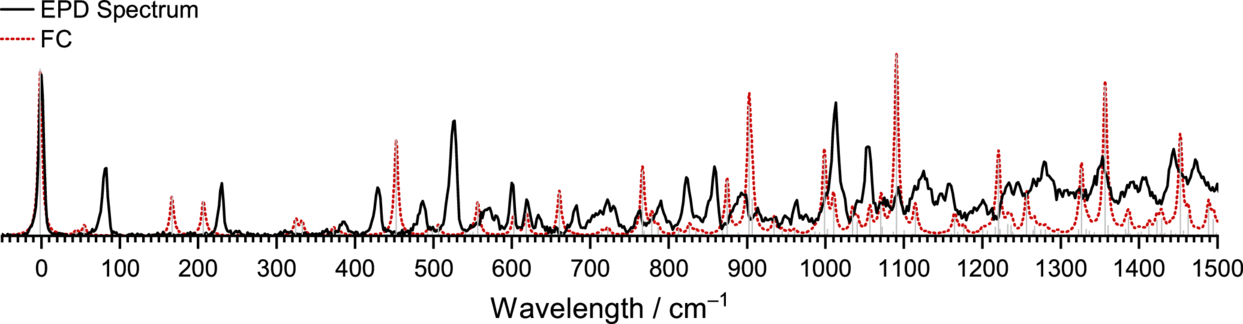 Franck–Condon (FC) simulation of the D3(2Aʹ)←D0(2Aʹ) transition of HMT+ (using optimized geometries of the D0 and D3 states with Cs symmetry—Figure 6; FWHM = 7 cm–1) compared to the experimental EPD spectrum as a function of the internal energy in the D3 state.