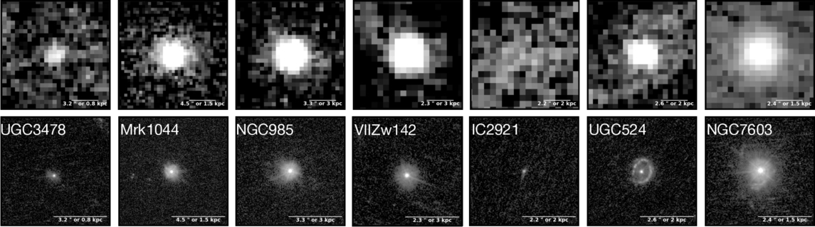 Cutout images of the Swift/UVOT data in the UVM2 band (top) and the HST UVIS data in the F225W band (bottom) for each source in the sample. These two filters have approximately the same central wavelength (2246.43 Å and 2357.65 Å, respectively), and the scale of each image is identical. The increased resolving power of the HST data reveals extended features that are not visible in the Swift/UVOT data. The difference in the UV magnitude of the central point source, as measured from the Swift and HST data, increases from left to right and is listed in Table 2.