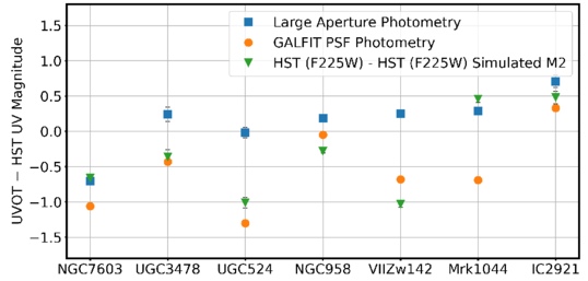 Magnitude differences from three different photometric measurements for each source. Blue squares: difference in the large-aperture photometry of UVM2 and F225W; orange circles: difference in the GALFIT point-source magnitude of UVM2 and F225W; green triangles: difference in the GALFIT point-source magnitude of the F225W data and the GalSim-simulated UVM2 data. NGC7603 compares the F225W filter with UVOT/UVW1 instead of UVOT/UVM2, as no UVM2 data were available for this source in K. K. Gupta et al. (2024). For all but one source, the difference in the point-source magnitude between HST and Swift/UVOT data is larger than that in the large-aperture photometry.