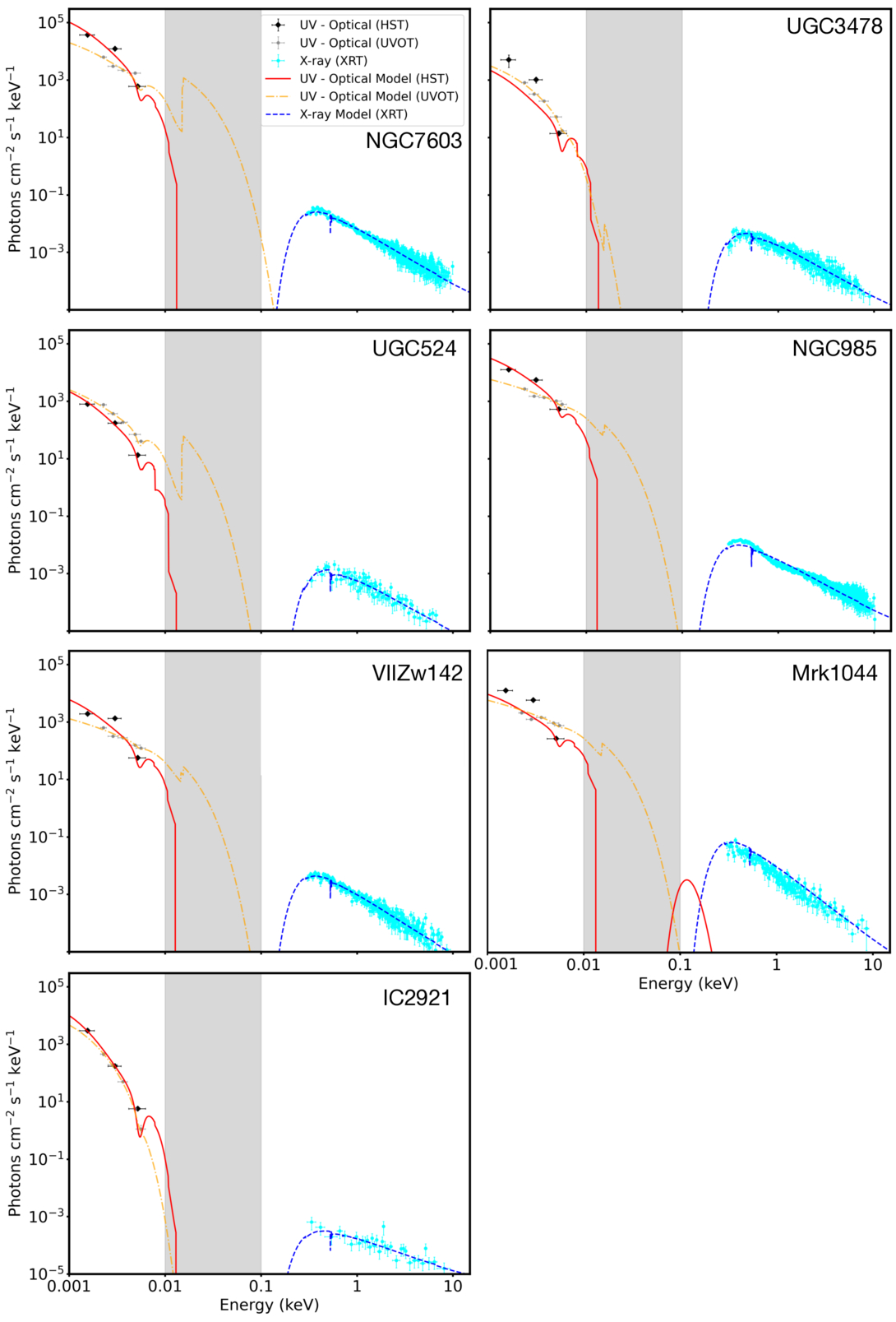 The optical/UV SEDs and Swift/XRT data fit with the XSPEC models as described in Section 3.4. Black data points and the red line show the HST data and fit, while gray data points and the orange line show the Swift/UVOT data and fits from G24. The models fit to the HST data include a photoionization absorption component that was not included in G24. This component affects the emission in the EUV, which is unconstrained in both datasets (shown in in gray).