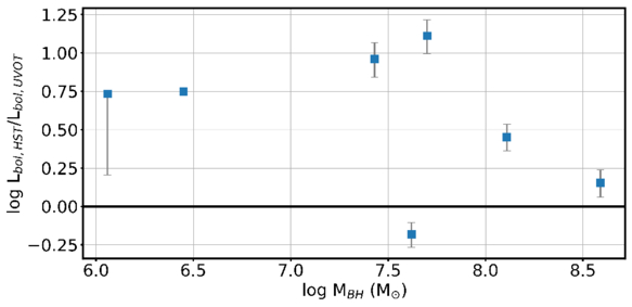 Ratio of the bolometric luminosity derived from the best-fit SEDs in this work using HST data in the UV–optical to the bolometric luminosity from G24 using Swift/UVOT data.