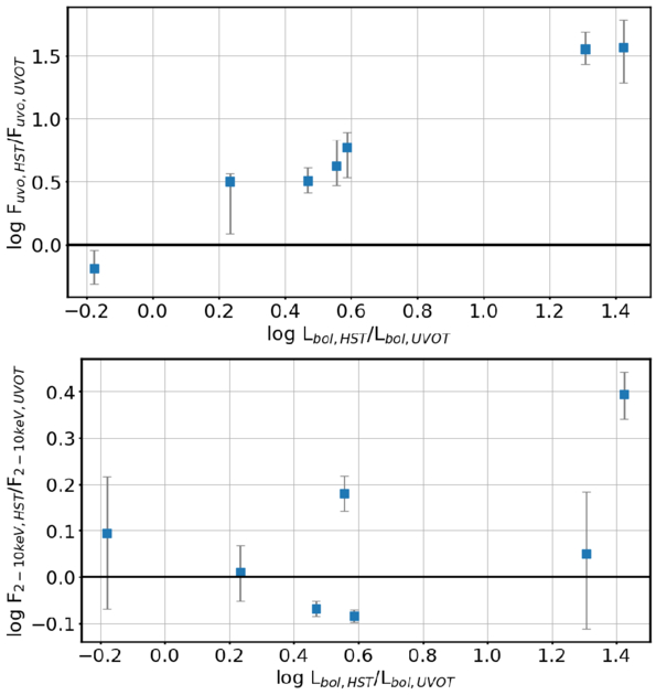 Top: ratio of the flux of the UV/optical disk flux (1 × 10−7–0.1 keV) derived from the best-fit SEDs in this work using HST data to the best UV/optical flux from G24 as a function of the difference in bolometric luminosities. Bottom: same as the top, but comparing the 2–10 keV flux derived in this work to that from G24.