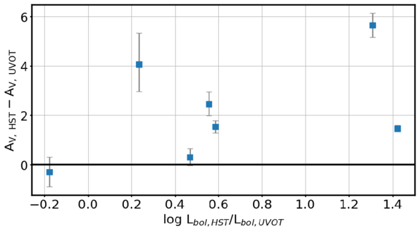 Difference in the extinction magnitude derived from the best-fit SEDs in this work using HST UV–optical data, compared to the extinction magnitude from G24 using Swift/UVOT data, shown as a function of the ratio of bolometric luminosities between the two datasets.