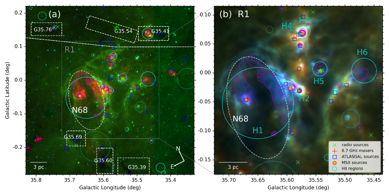 Overview of the G35 complex. Panel (a) shows a Spitzer RGB-composite image (24, 8, and 3.6 μm) of the region surrounding MIR bubble N68. Panel (b) zooms in on region R1 in a Herschel RGB-composite (350, 160, and 70 μm). Overlaid on both panels are tracers of massive star formation: MAGPIS radio sources (green crosses), 6.7 GHz methanol masers (red pluses), ATLASGAL 870 μm peaks (blue squares), MSX MYSO candidates (orange dots), and WISE H II regions (cyan circles). The 20 cm radio continuum (magenta contours; levels start from 0.0008 to 0.0088 in steps of 0.0016 Jy beam−1) traces the inner rim of bubble N68, outlined by a white dashed ellipse. White dashed rectangles mark dark clouds identified in X. Shen et al. (2024).