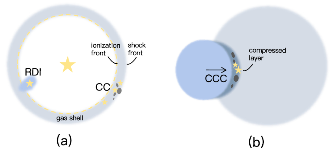 Schematics of induced star formation mechanisms in terms of CC, RDI, and CCC, respectively.