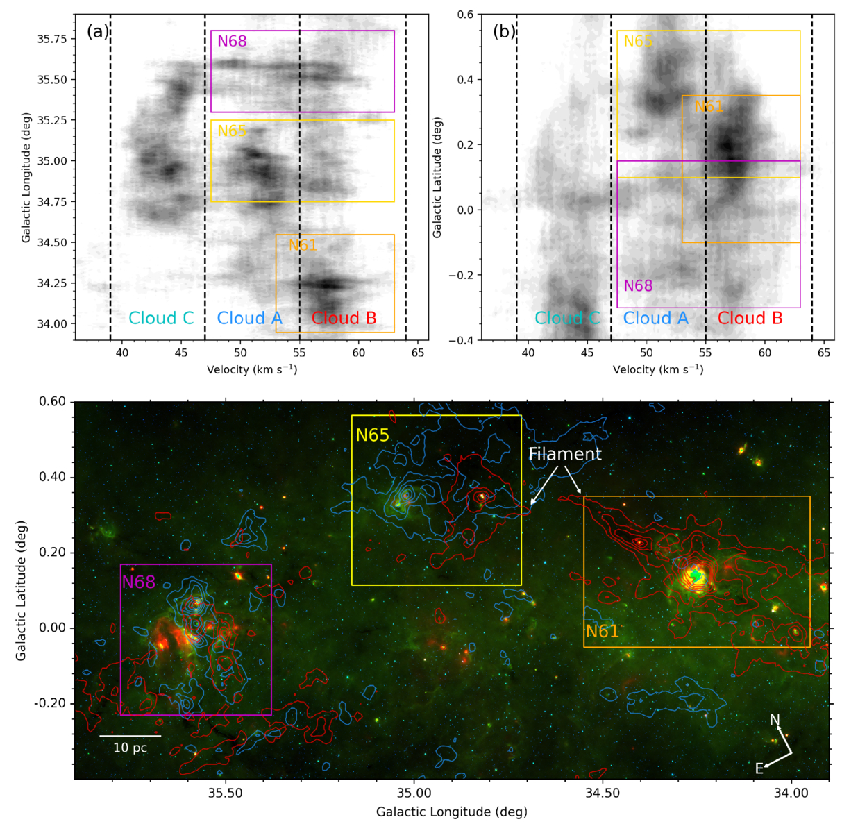Overview of large-scale gas distribution around the G35 complex. Panels (a) and (b) are 13CO l − PV and b − PV diagrams, respectively. The vertical dashed line divided the gas into three individual components, namely, Cloud A [47, 55] km s−1 , Cloud B [55, 64] km s−1, and Cloud C [39, 47] km s−1 . The magenta, yellow, and orange boxes indicate the counterpart gas with bubbles N68, N65, and N61, respectively. Panel (c) is the 13CO gas distribution in terms of Cloud A (blue) and Cloud B (red), respectively. The three colored boxes are the regions of N68 (magenta), N65 (yellow), and N61 (orange), respectively. The background image is the RGB-composite image (R: 24 μm, G: 8.0 μm, and B: 3.6 μm).