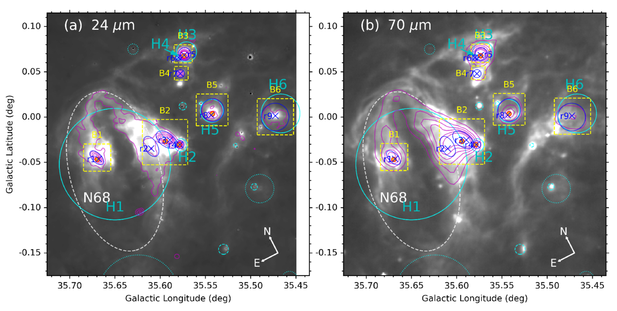 (a) Spitzer 24 μm and (b) Herschel 70 μm images with overlaid MAGPIS 20 cm contours (from 0.0008 to 0.0088 in steps of 0.0016 Jy beam−1) and NVSS 21 cm contours (from 0.02 to 0.22 in steps of 0.04 Jy beam−1) in magenta, respectively. The blue crosses and ellipses represent the peaks (markers from r1 to r9) and extents of the local clumps of the 20 cm radio continuum emission, respectively. These subregions are highlighted by yellow boxes with markers from B1 to B6. The known H II regions are fitted by cyan circles with markers from H1 to H6. The other symbols are drawn in the same manner as in Figure 1.