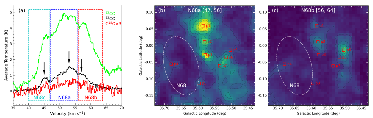 Overview of the average spectra and spatial distribution of the main components related to bubble N68. (a) shows the average spectra of the R1 region. Green, black, and red lines indicate the average spectra of 12CO, 13CO, and C18O, respectively. Blue, red, and cyan dashed boxes highlight the three main gas components, namely, N68a [47, 56], N68b [56, 64], and N68c [40, 47], respectively. Black arrows depict the system velocity for each component (i.e., 53, 57, and 45 km s−1 for N68a, N68b, and N68c, respectively). Panels (b) and (c) show the 13CO spatial distribution of N68a (integrated from 47 to 56 km s−1 ) and N68b (integrated from 56 to 64 km s−1 ), respectively. The contours are drawn at 8.1 K km s−1 (3σ) to 45.9 K km s−1 in steps of 5.4 K km s−1 (2σ). The red squares labeled p1 to p8 represent the positions of the local intensity peaks, where the spectra are extracted in Figure 7.