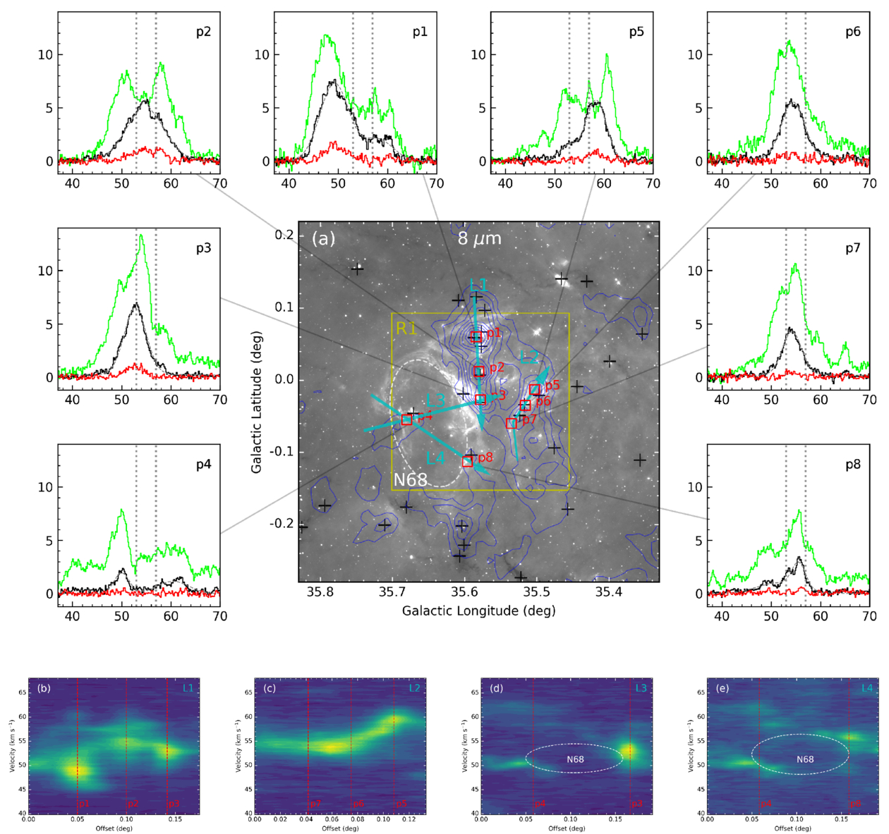 Spectra and PV slices of N68. Panel (a) shows the integrated-intensity 13CO (1–0) map of the region and the locations for extracting spectra. The contour levels start from 15 (3σ) to 55 K km s−1 in steps of 5 K km s−1 (1σ). The background image shows the 8 μm emission. The yellow box highlights the region of R1. The white dashed ellipse depicts the layout of the N68 bubble. The black pluses represent the ATLASGAL clumps. Local integrated-intensity peaks have been marked by red squares and labeled p1 to p8. 12CO (1–0) (green), 13CO (1–0) (black), and C18O (1–0) (red) spectra at each of these peak locations have been extracted. The black dashed lines are Gaussian fitting lines for 13CO spectra. Panels (b) to (e) show the PV slices along the paths L1 to L4 as shown in panel (a). The vertical dashed lines indicate the locations of local peaks on each path.