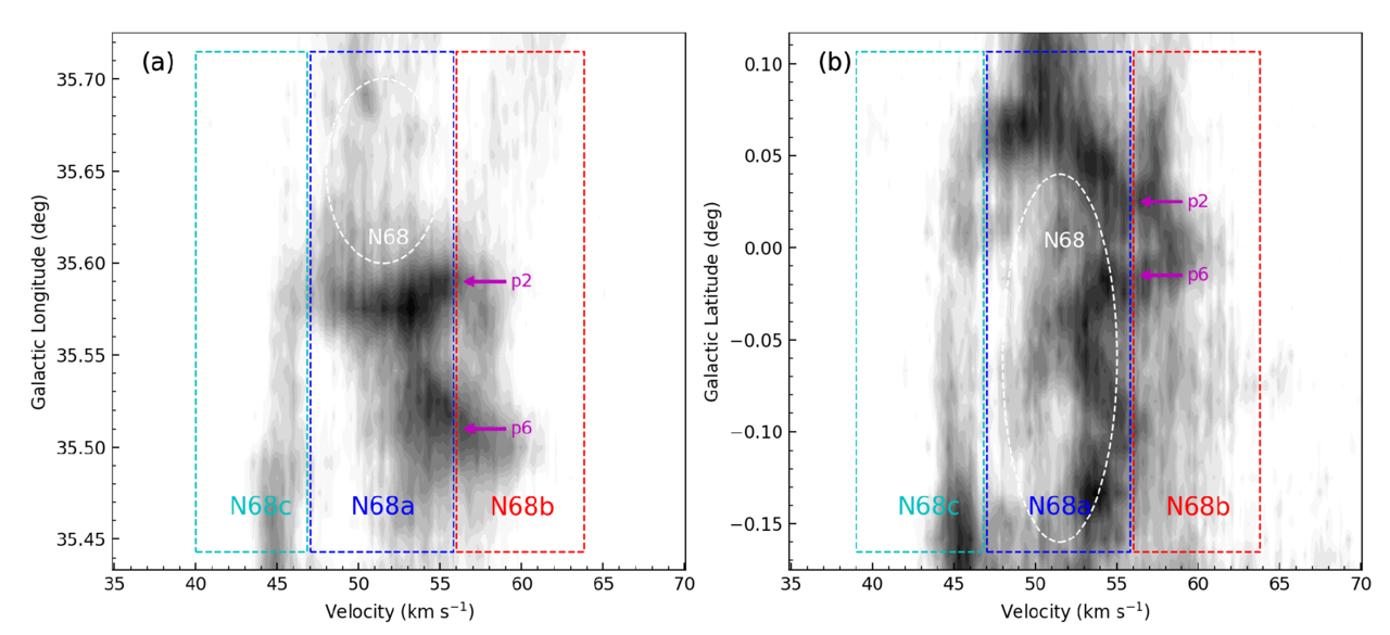 PV maps of 13CO (1–0) gas of the R1 region. Panels (a) and (b) are l-PV and b-PV maps, respectively. Three prominent gas components, namely, N68a, N68b, and N68c, are highlighted by blue, red, and cyan dashed boxes, respectively. The projection of bubble N68 is depicted by a white dashed ellipse. The bridge features connecting N68a and N68b are marked by magenta arrows, which correspond to the locations of p2 and p6 in Figure 7, respectively.