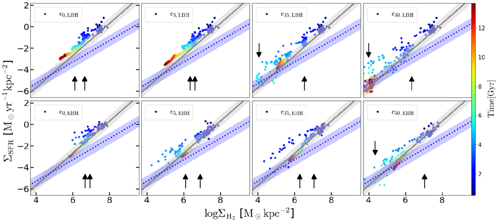 ΣSFR vs. ﹩{{\rm{\Sigma }}}_{{{\rm{H}}}_{2}}﹩ for all gas inside 0.1Rvir. ﹩{{\rm{\Sigma }}}_{{\rm{SFR}}}=A{({{\rm{\Sigma }}}_{{{\rm{H}}}_{2}})}^{n}﹩ with depletion times of τdep = 2 Gyr and slope n = 1 (e.g., F. Bigiel et al. 2008; A. K. Leroy et al. 2013) is given by dotted line, while τdep = 0.5 Gyr and n = 1.5 (e.g., R. Genzel et al. 2015; N. Scoville et al. 2017; L. J. Tacconi et al. 2018) is given by the solid line. The color of the markers indicates time. The shaded regions represent ±0.5 dex around the relations. There is a single data point for each 30 Myr of evolution during z = 9–0. The black arrows indicate z = 2 and z = 1.