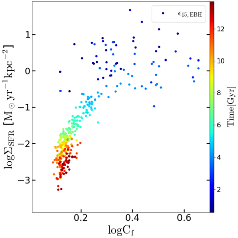 Star formation rate surface density, ΣSFR, vs. “clumping factor,” Cf (see definition in the text) within R1/2 for the ϵ15,EBH model. Marker color represents time in Gyr.